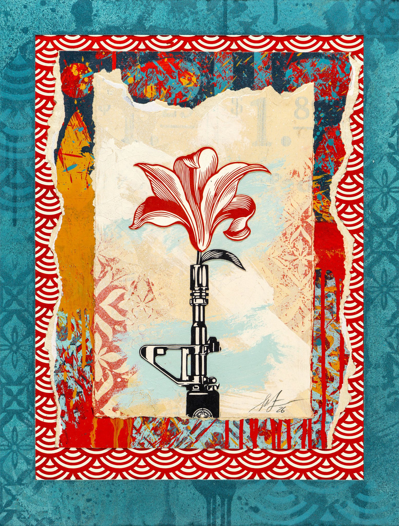 Shepard Fairey AR-15 Lily Letterpress Study 2026 MediumMixed Media (Stencil, Silkscreen, and Collage) on Paper Edition TypeUnique Share this piece