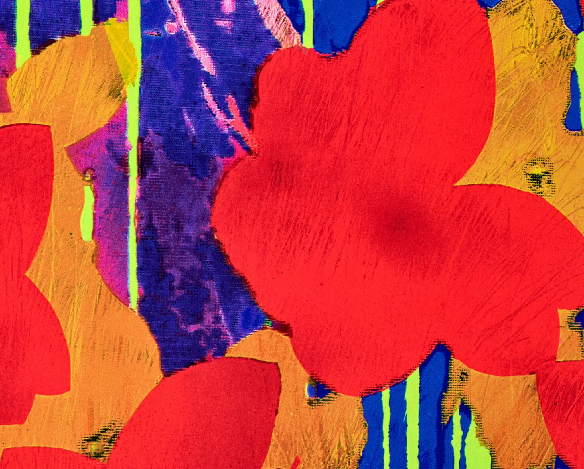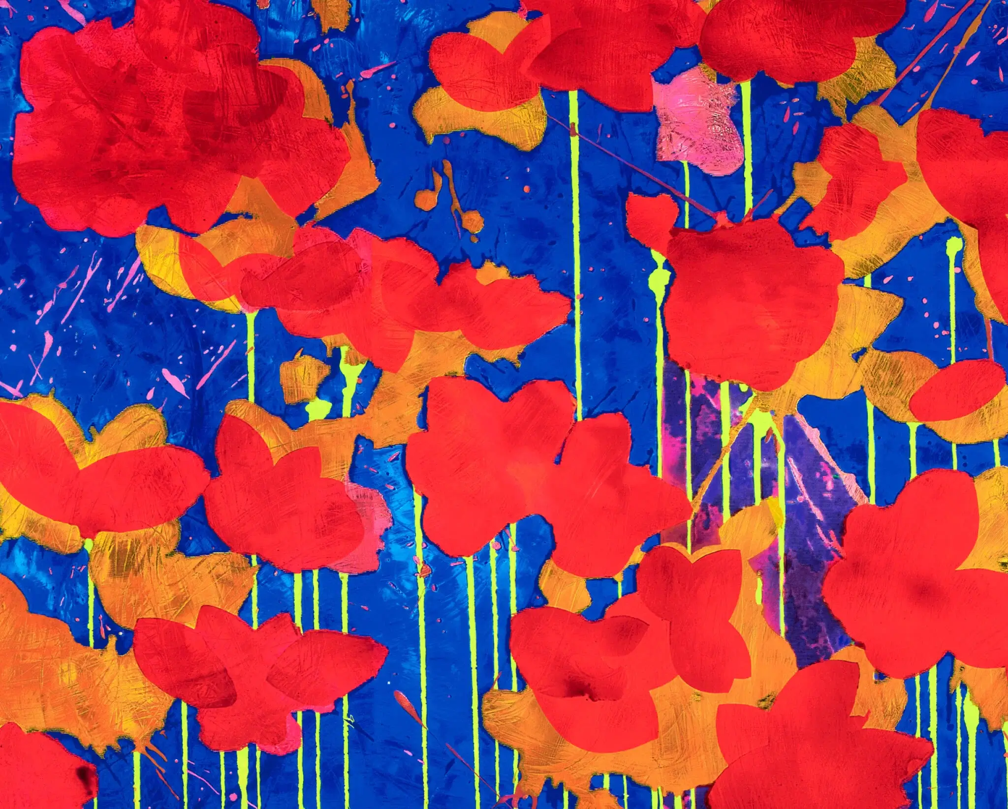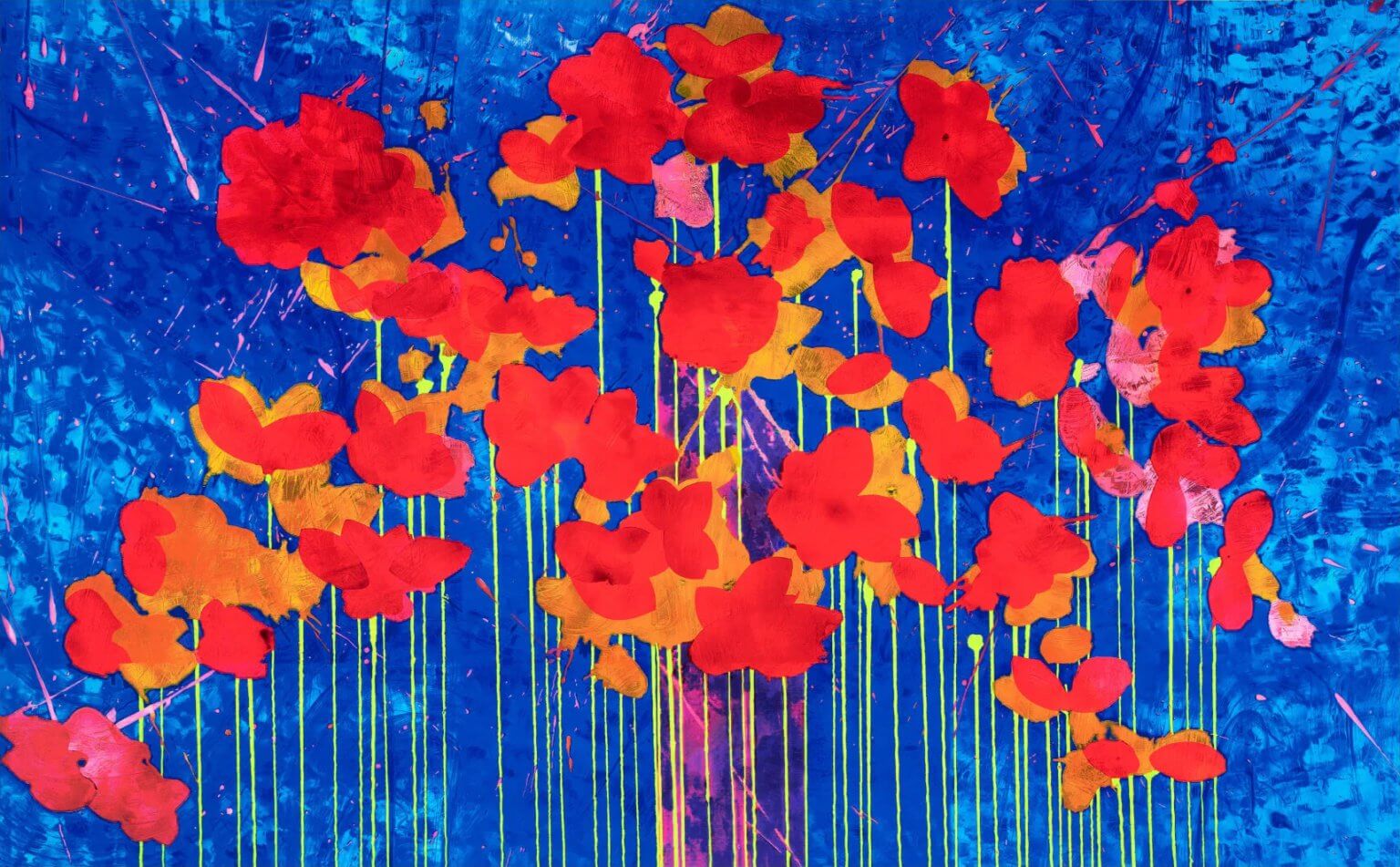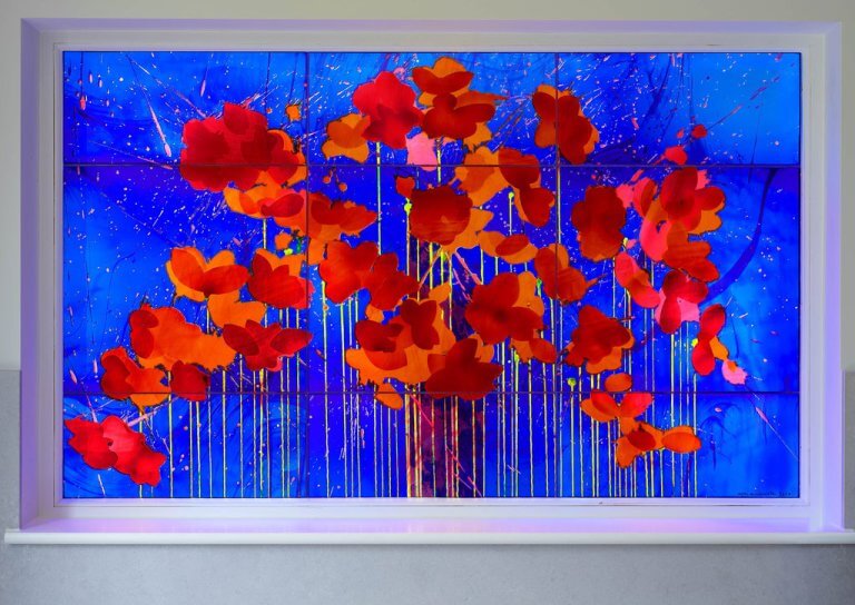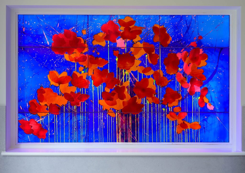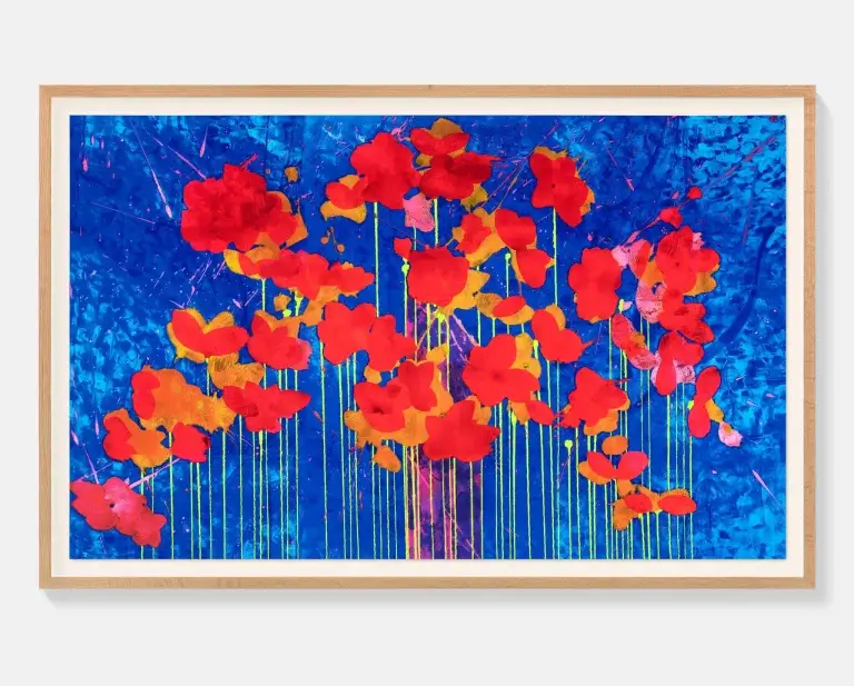 Blazing Devotion is a 25-colour silkscreen with gloss varnish that translates Sir Brian Clarke’s 2021 Wimbledon stained-glass window onto paper. Against a vivid blue ground, scarlet poppies hang on thin dripping stems, their translucent petals etched through two flash layers where stained glass traditionally uses one — a technique Clarke called “the key that unlocks the future for stained glass.” It was, in his own words, the first print he had ever seen that gave him the experience of looking at glass rather than reproducing it.