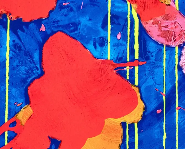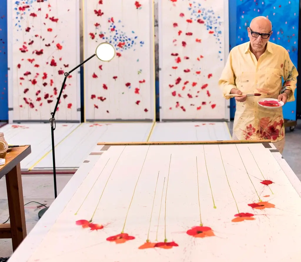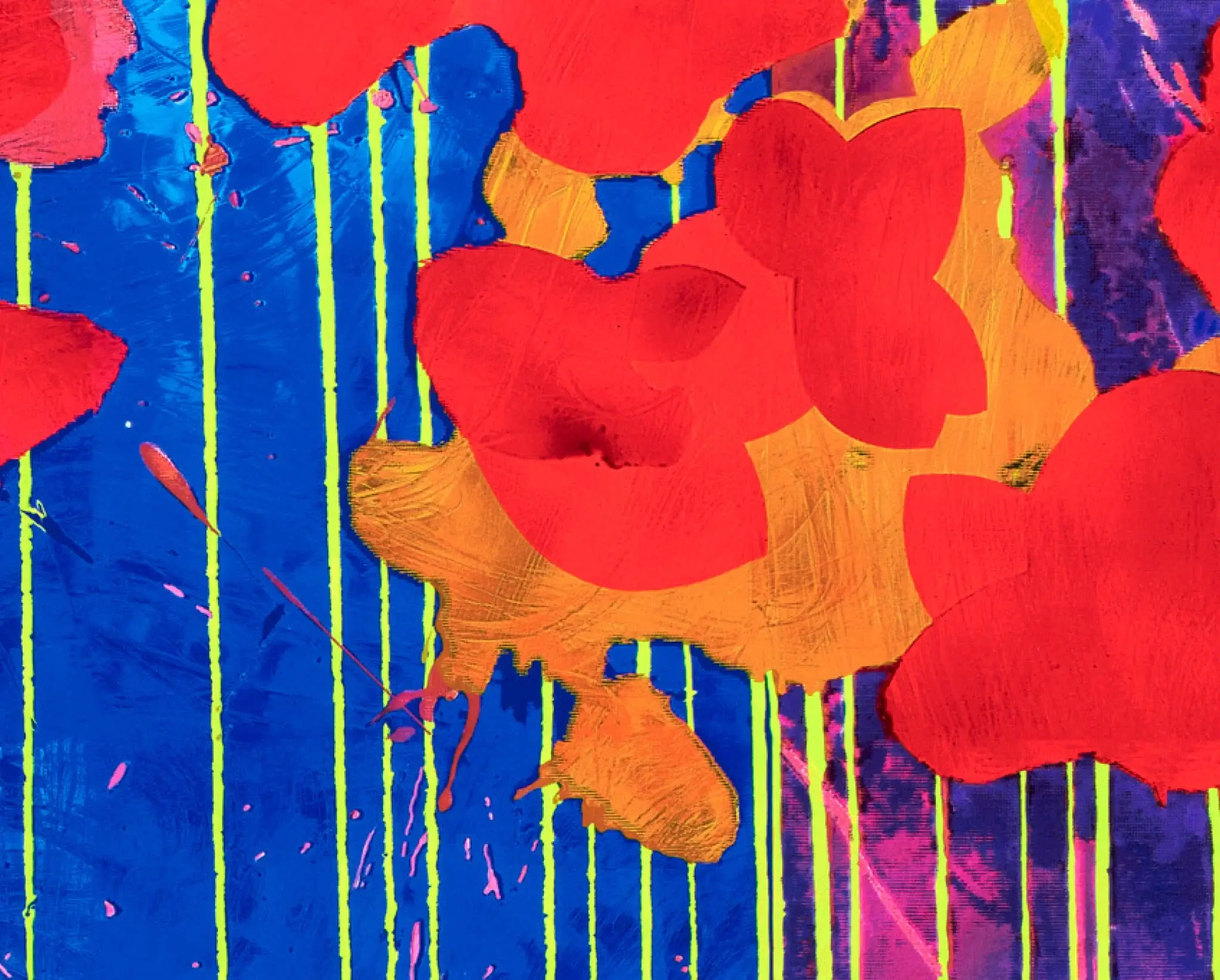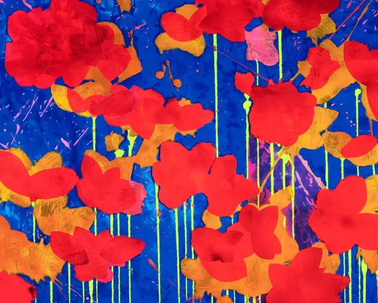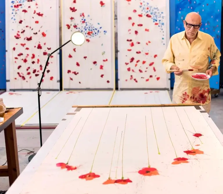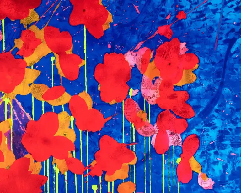 Blazing Devotion is a 25-colour silkscreen with gloss varnish that translates Sir Brian Clarke’s 2021 Wimbledon stained-glass window onto paper. Against a vivid blue ground, scarlet poppies hang on thin dripping stems, their translucent petals etched through two flash layers where stained glass traditionally uses one — a technique Clarke called “the key that unlocks the future for stained glass.” It was, in his own words, the first print he had ever seen that gave him the experience of looking at glass rather than reproducing it.