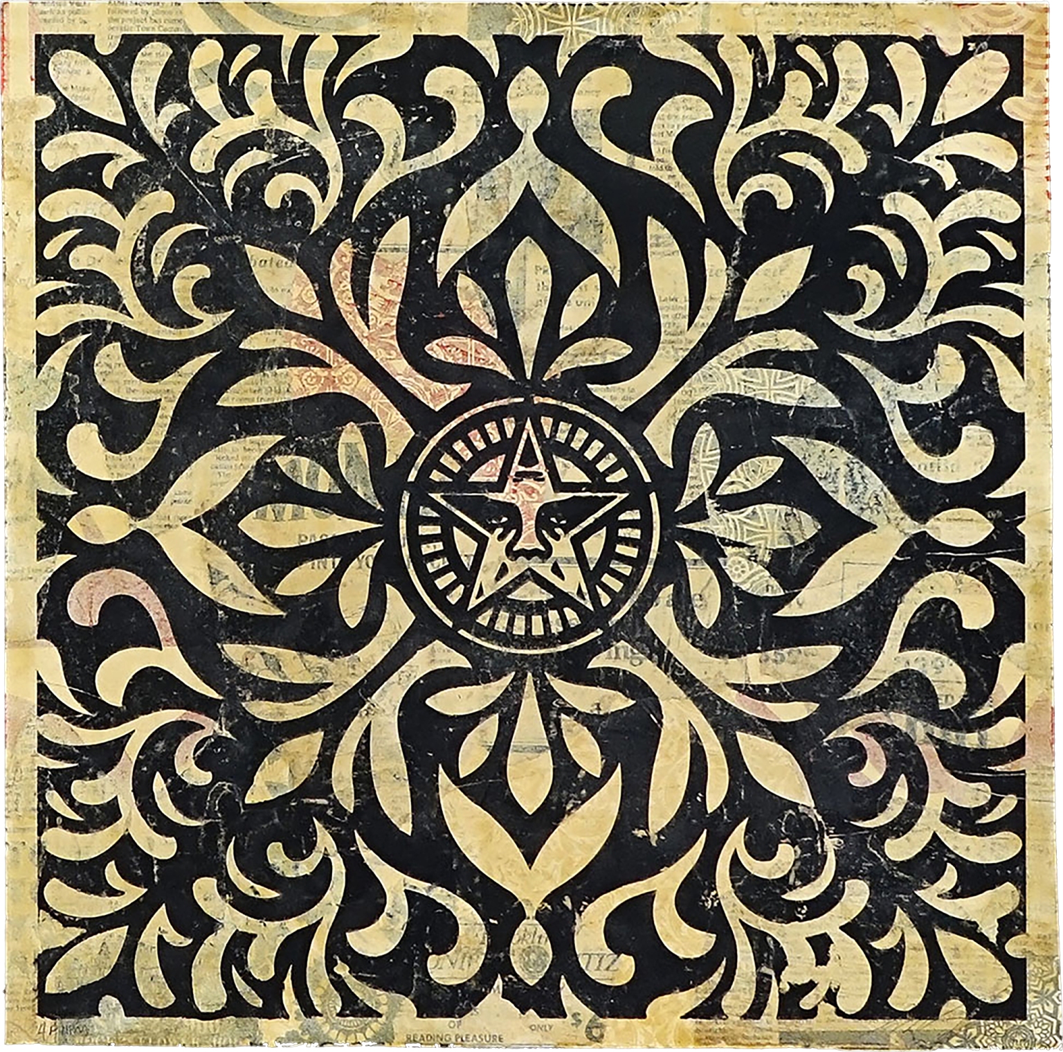 Shepard Fairey Japanese Fabric Pattern – Black II 2011 Artwork 18 × 18 in / 45.72 × 45.72 cm Framed 35.5 × 35.5 in / 90.17 × 90.17 cm Edition TypeHPM (Hand-Painted Multiple) Edition AP COAYes (Obey Fine Art Editions) Share this piece